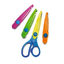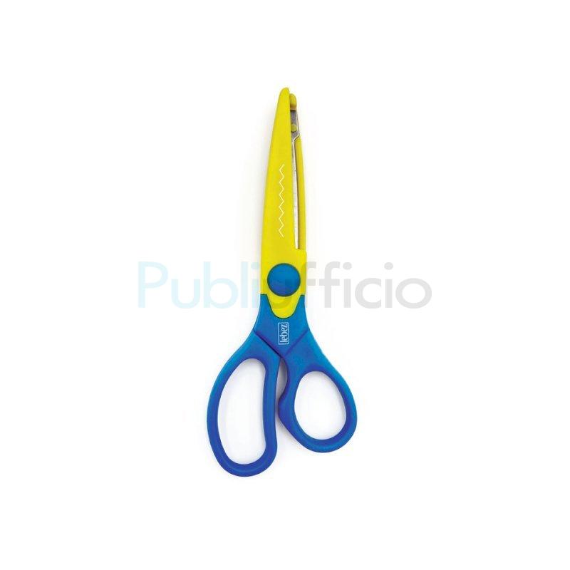 Forbici Snippy Zig-Zag con lama in metallo da 16 cm. Blister composto da un paio di forbici (impugnatura colore blu) con 4 lame intercambiabili e impugnatura in gomma. Disponibili in colori assortiti: rosa, verde, giallo e arancione. Ideali per bricolage.