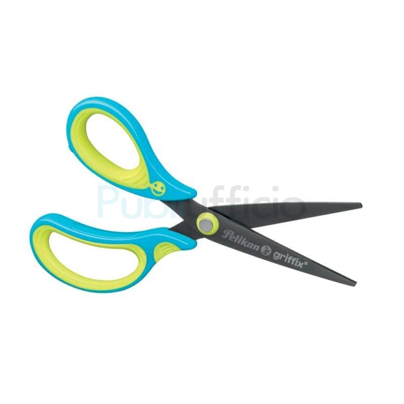 Forbici Griffix per mancini. Lunghezza: 15 cm. Colore: Neon Fresh Blue. Ideali per uso scolastico: lavori di taglio piccoli e delicati. Realizzate con lama in acciaio resistente, rivestito in nitruro di titanio. Grazie all'impugnatura egonomica sono particolarmente adatte ai bambini. Impugnatura realizzata in plastica priva di PVC e lattice. La linea Griffix aiuta a mantenere la corretta posizione della mano grazie al classico volto sorridente. Disponibili in confezione da 5 pezzi.