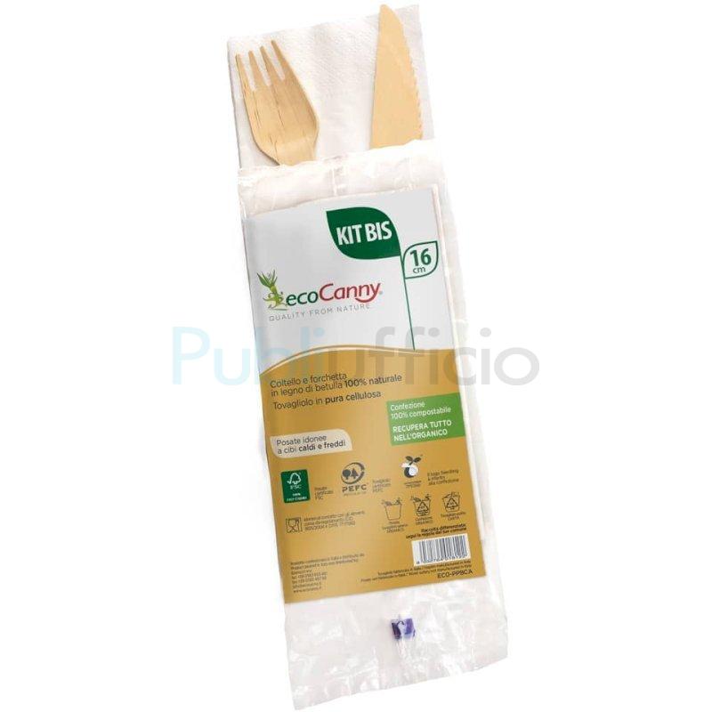 Kit forchetta coltello tovagliolo bio-compostabili ecoCanny in legno di betulla conf. 200 pz - ECO-PPBCA