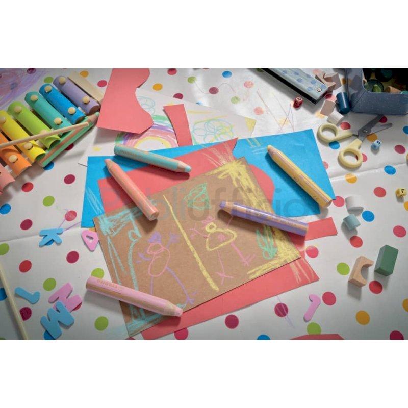 Matita colorata, pastello a cera, acquarello: il pastellone tuttofare. Stabilo woody 3 in 1 può scrivere su innumerevoli superfici come legno, vetro, plastica, cartone e lavagne, grazie alla sua mina morbidissima e ricca di colore. Può essere rimosso facilmente da tutte le superfici lisce e porose (finestre e lavagne bianche e nere): basta un panno umido. Stabilo woody 3 in 1 è fatto da legno 100% certificato PEFC, proveniente da foreste sostenibili. Non sbava è inodore ed offre prestazioni di lunga durata. In poche parola è lo strumento ecologico ed ideale per contrassegnare e scrivere su differenti superfici. Prodotto in conformità con il regolamento REACH (CE) n. 1907/2006. I pastelli Stabilo woody 3 in 1 sono l'ideale per bambini e genitori - sono lavabili dal vetro e possono essere utilizzati su molteplici superfici, non solo carta o cartone. Il matitone colorato Stabilo woody 3 in 1 è disponibile in 18 colori, ma funge anche da pastello a cera ed acquarello. Grazie al colore intenso ed opaco, può essere utilizzato anche per colorare su fogli scuri. Stabilo woody 3 in 1 è talmente versatile che viene utilizzato anche dagli artisti più esperti. Elevata opacità e intensità di colore anche su fogli scuri e sul vetro. Punta XXL - contiene una quantità di colore equivalente a quella di 8 matite colorate standard. Perfetto per colorare ampi spazi e adatta per qualsiasi tecnica di pittura. Fusto grosso ideale per le mani dei bambini: ideale per la presa corretta della matita. Mina antirottura, diametro di 10 mm. Tratto grosso e morbido. Confezione composta da 6 pezzi colori pastello.