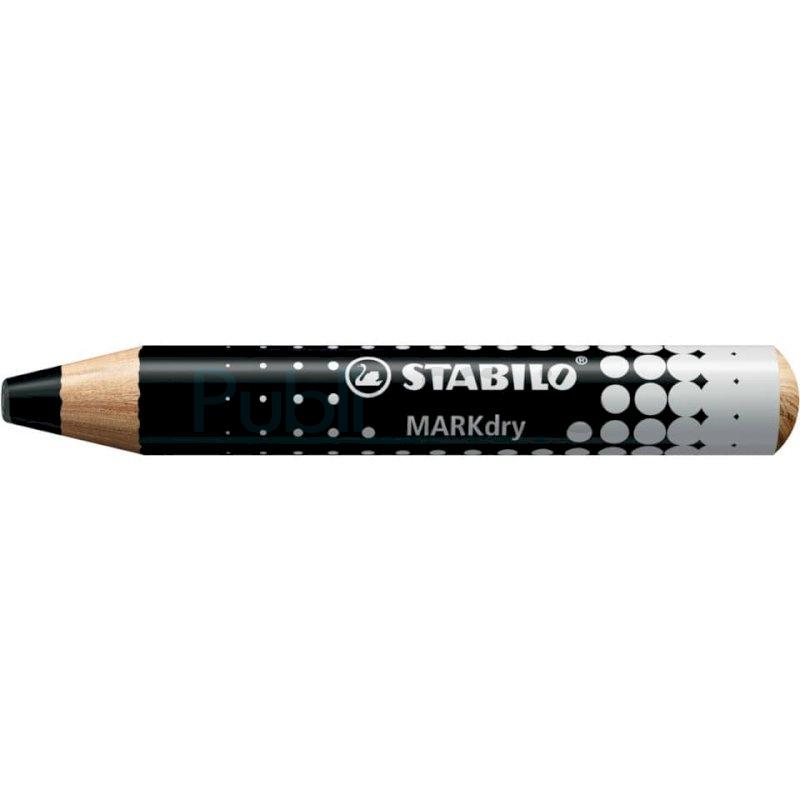 Stabilo MARKdry è un matitone colorato pensato per lavagne bianche e a fogli mobili. Colore: nero. Proprio come se fosse un marcatore, scrive su lavagne bianche, in ardesia e a fogli mobili, oltre alla carta e diverse superfici lisce come il vetro. Inoltre, può essere cancellato con un semplice panno umido o asciutto. Grazie alla robusta mina XXL, il colore rimane intenso fino all'ultimo tratto. Stabilo MARKdry è pronto all'uso in qualsiasi momento! Non secca, non macchia, è inodore ed è cancellabile senza lasciare tracce e sbavature. Perfetto per la scuola o per l'ufficio, è realizzato al 100% con legno ecosostenibile e certificato PEFC.