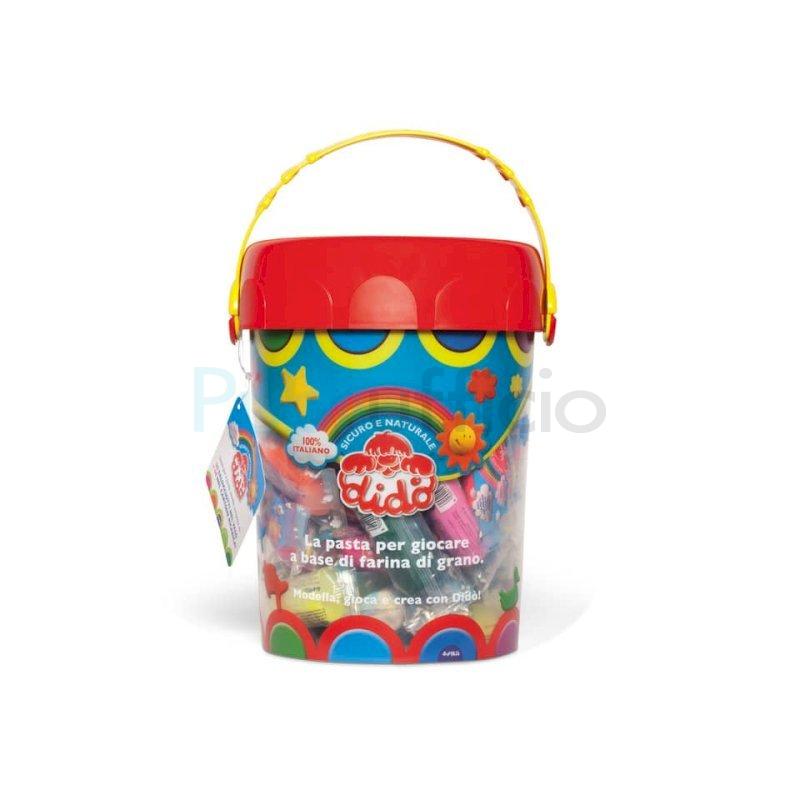 Maxi vaso espositore di pasta modellabile Didò con maniglia e coperchio a pressione. Dimensioni: Ø 21 cm x H.20 cm. Studiato per la vendita dei salsicciotti sfusi. Composto da 100 salsicciotti assortiti nei colori seguenti: bianco, giallo, verde, rosa, azzurro, magenta, rosso, verde fluo, azzurro fluo, arancione, viola e nero. Ideale per giocare e creare divertendosi.