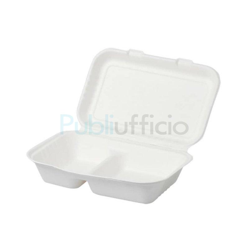 Menù Box realizzato in polpa di cellulosa e suddiviso in 2 scomparti. Colore bianco. Dimensioni: 230 x 65 x 150 mm. Peso netto unitario: 31 grammi. Ideale per riporre e trasportare fino a 2 differenti pietanze. Adatti al contatto con alimenti: fino a una temperatura massima di 90 °C per 30 minuti, in microonde fino a 800 Watt per 2 minuti. Non utilizzabile in forno né in congelatore. Confezione composta da 50 pezzi.