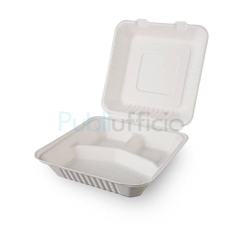 Menù Box realizzato in polpa di cellulosa e suddiviso in 3 scomparti. Colore bianco. Dimensioni: 220 x 204 x 80 mm. Peso netto unitario: 37 grammi. Ideale per riporre e trasportare fino a 3 differenti pietanze. Adatti al contatto con alimenti: fino a una temperatura massima di 90 °C per 30 minuti, in microonde fino a 800 Watt per 2 minuti. Non utilizzabile in forno né in congelatore. Confezione composta da 50 pezzi.