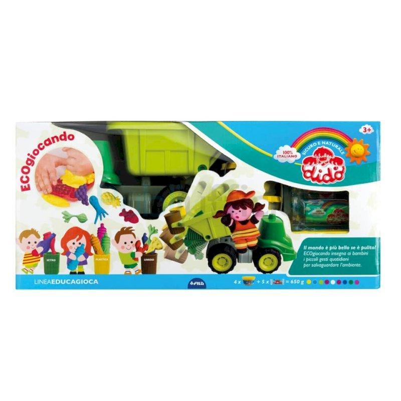 Per sensibilizzare i piccoli a prendersi cura dell'ambiente, Dido' presenta Ecogiocando: un kit innovativo e dalla tematica attuale. Il riciclo diventa un gioco in cui si modellano gli elementi grazie alle 4 formine incluse nella confezione per poi differenziarli nei bidoncini di plastica colorati che verranno in seguito trasportati con un vero camioncino a ribalta in plastica. Sono inclusi tanti elementi in cartotecnica, operatori ecologici e un bidone dell'indifferenziata. Contenuto: 1 camioncino; 4 vasetti Didò da 100 g; 5 salsicciotti da 50 g; 4 formine; 3 bidoncini; 1 coltellino e mattarello; 1 cartoncino con soggetti da montare e 1 scatola cassonetto.