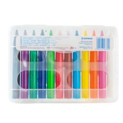 Pastelli a cera acquerellabili. Hanno 12 colori accesi e brillanti che consentono molteplici e originali risultati creativi, basta passare un pennello inumidito sulle aree colorate. Disponibili in astuccio appendibile trasparente realizzato in PP composto da 12 pezzi con raschietto per gesso. Assortimento colori: bianco, rosa, giallo, arancione, azzurro, marrone, rosso, verde, blu, verde scuro, porpora e nero. Dimensioni pastello a cera: 9,8 x 1,2 cm. Dotati di manicotto scorrevole.