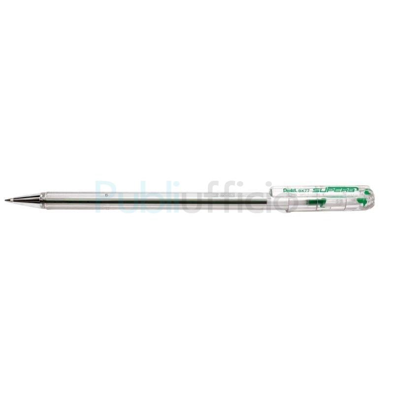 Penna a sfera Pentel Superb BK77 colore verde. Punta fine 0,7 mm. Fusto trasparente per un immediato controllo della riserva dell'inchiostro - lunghezza di scrittura 1200 mt. Confezione da 12 pezzi.