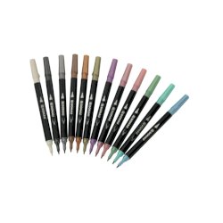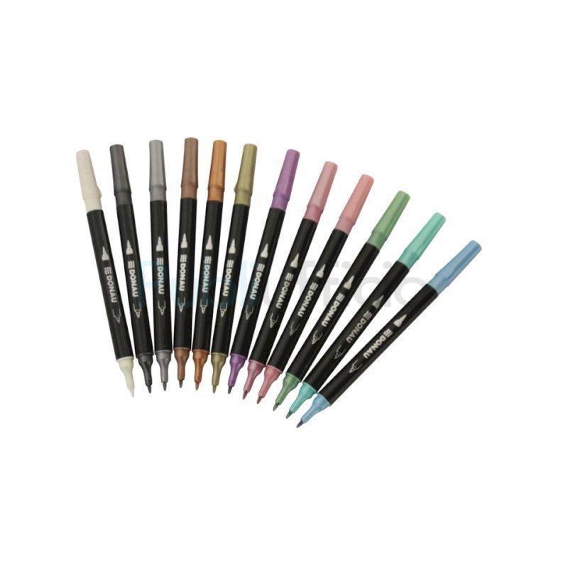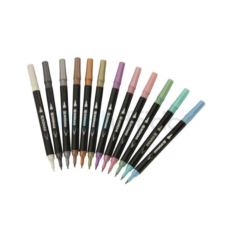 Pennarelli con punta in fibra Metallic Duo. Realizzati a doppia punta: morbida per linee larghe o per colorare e fine per linee sottili e precise. I colori sono a base d'acqua con effetto metallizzato e lucido di alta qualità. Adatti all'utilizzo su materiali quali: carta, tela, cartone. Inlcude il colore bianco per dipingere su uno sfondo nero. Disponibili in confezione da 12 pezzi in colori assortiti.