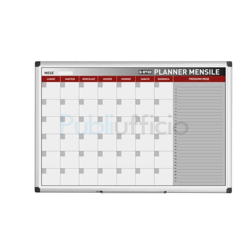 Planning magnetico mensile Bi-Office. Cornice in alluminio. Uno strumento di pianificazione versatile che consente di organizzare le mansioni del mese a venire. Superficie magnetica cancellabile a secco di alta qualità. Scrittura e pulizia facile. In dotazione con pennarello, vassoio portapenne, calamite e kit di montaggio a parete in Italiano.