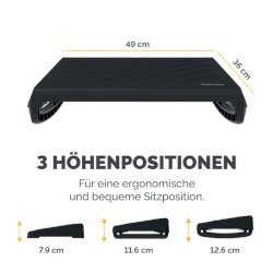 Breyta™ Poggiapiedi con grande piattaforma regolabile in 3 livelli di altezza: 79/116/126 mm. Misura della piattaforma 490x360 mm.Le gambe si inseriscono nel corpo principale sotto la piattaforma. Movimento oscillante per migliorare la circolazione. Design portabile ed ergonomico, moderno e semplice. Dimensioni 9,8 x 49 x 36 cm. Materiale 100% riciclabile e garanzia 5 anni. Colore nero.