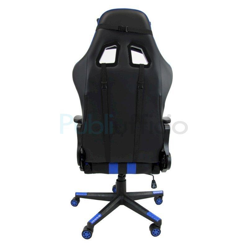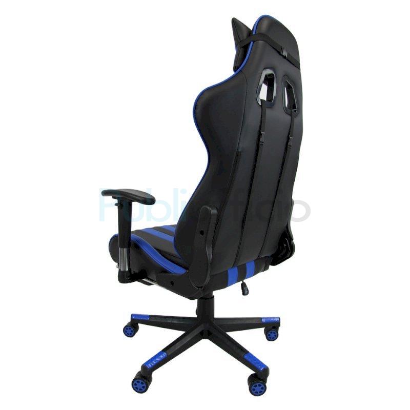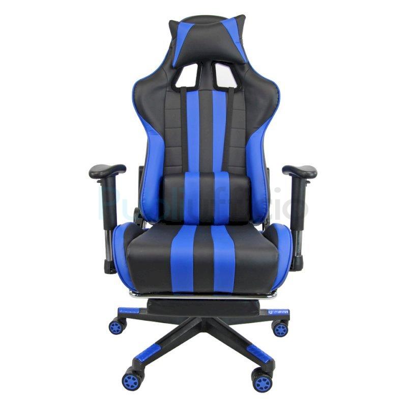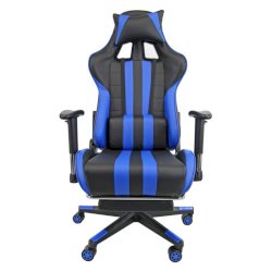 Poltrona da gaming girevole con rivestimento in sky nero/blu. Fornita con braccioli regolabili 3D, supporto poggiagambe regolabile, cuscino per cervicale e cuscino lombare. Poggiapiede nero. Taglia L. Utilizzo consigliato INTENSO H24. Portata massima 150 Kg. Struttura acciaio. Base nylon. Ruote Ø 50 mm nylon. Sedile: materiale esterno: pvc; materiale interno: multistrato; spugna: t 25. Schienale: materiale esterno: pvc; materiale interno: multistrato; spugna: t 25. Meccanismi: elevazione a gas - possibilità di reclinare lo schienale a 180° - meccanismo oscillante con blocco. Certificazioni: Gas certificato TUV. Altezza totale: 123 - 133 cm. Profondità totale: 70 cm. Altezza sedile (seduta da terra): 42 - 52 cm. Larghezza sedile: 52 cm. Larghezza del sedile con i braccioli: 67 cm. Profondità sedile: 52 cm. Altezza schienale: 82 cm. Larghezza schienale: 56 cm. Altezza braccioli da terra: 60 - 68 cm. Base: Ø 70 cm.
