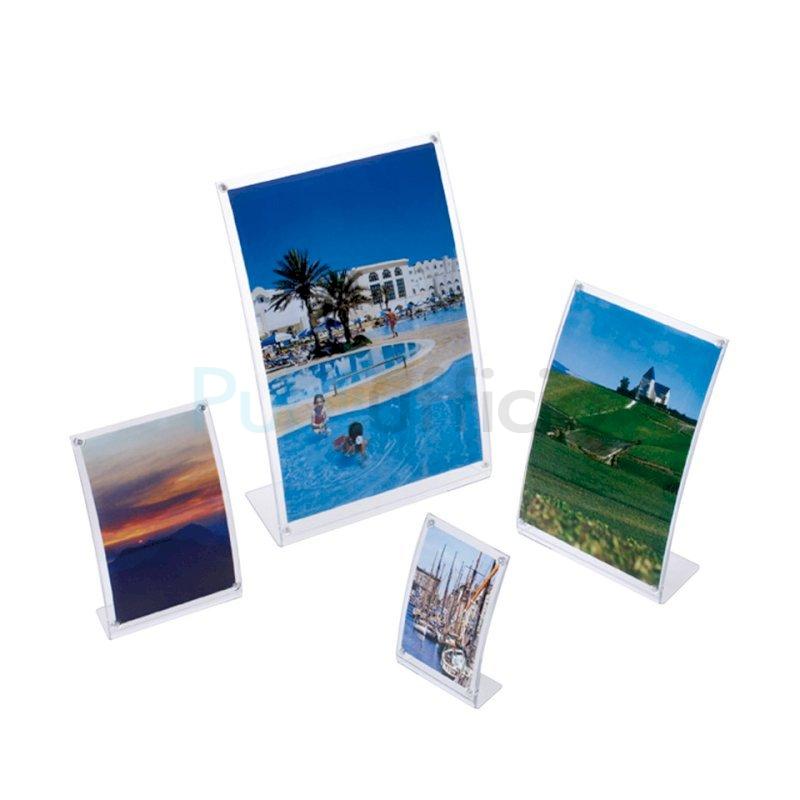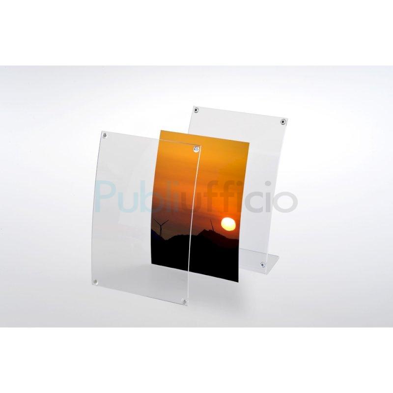Porta avvisi/fotografie formato A4 magnetico da tavolo, curvo, per uso verticale. Realizzato in materiale acrilico trasparente. Questa cornice, con la sua linea semplice e pulita, garantisce una perfetta visibilità del contenuto e particolari in evidenza.