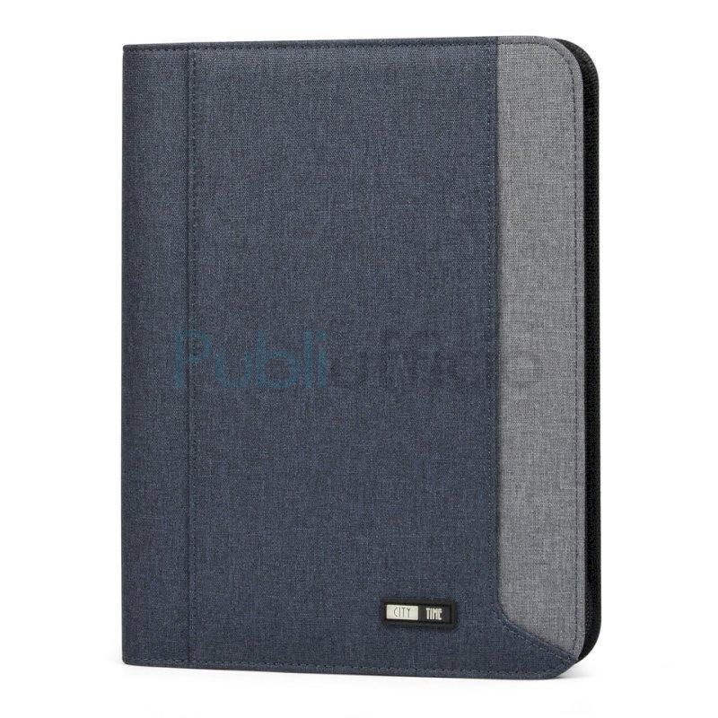 Portablocco A4 linea DUAL bicolore in tessuto tecnico, chiusura con zip, scomparti per biglietti, tasca interna portadocumenti, portapenna, completo di blocco. Dimensioni 26 x 34 cm. Colore grigio.