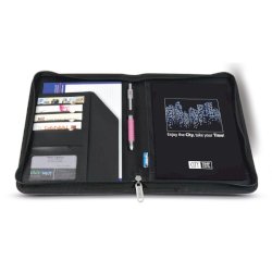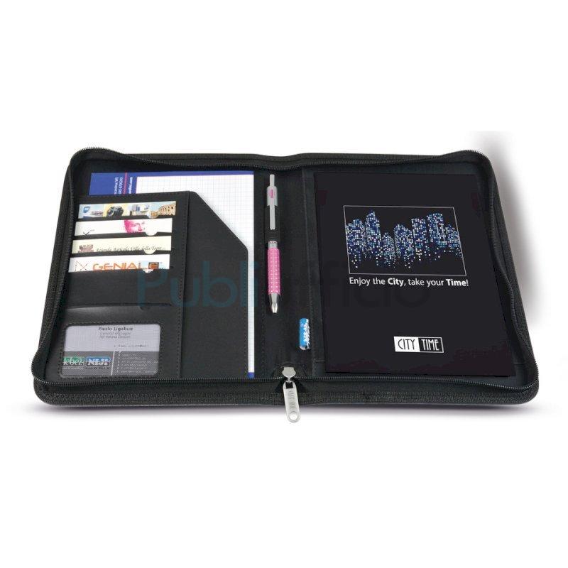 Portablocco A5 linea DUAL bicolore in tessuto tecnico, chiusura con zip, scomparti per biglietti, tasca interna portadocumenti, portapenna, completo di blocco. Dimensioni 20x25,5 cm. Colore nero.