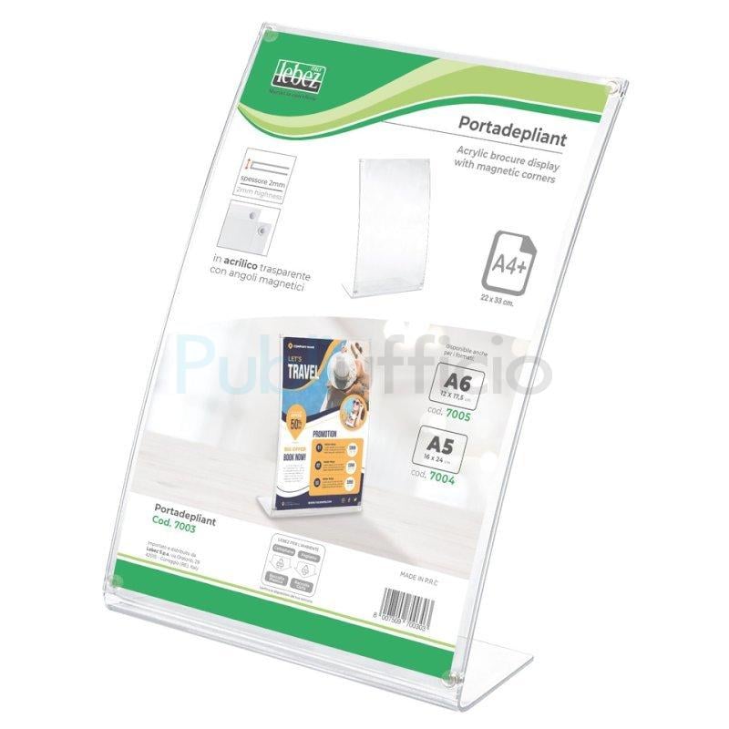 Portadepliant in acrilico con base a L - angoli magnetici Lebez A4 - verticale - trasparente - 7003