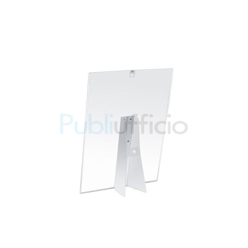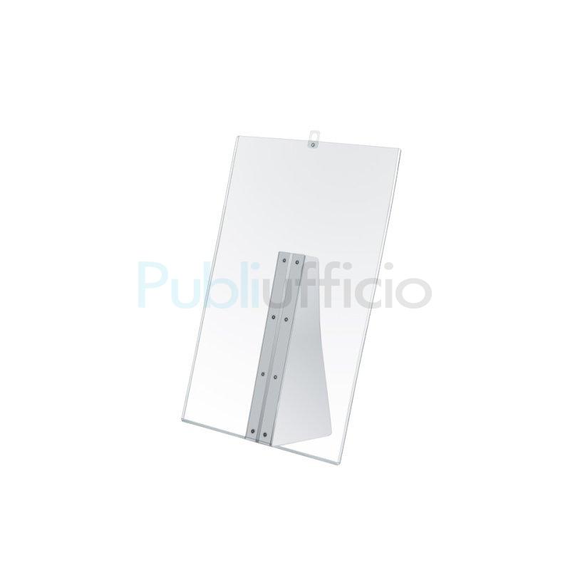 Portadepliant A4 in PVC semirigido appendibile e da appoggio, con gancio girevole per posizionamento a parete. Formato A4. Colore trasparente.