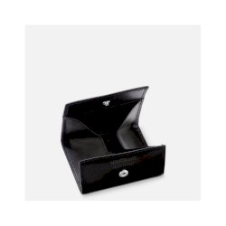 Portamonete piccolo con chiusura a pressione in pelle di vitello nero in pieno fiore europea, anello Montblanc con finitura in palladio. Spaziosa tasca per le monete e chiusura con bottoncino a pressione. Dimensioni 85x15x70 mm.