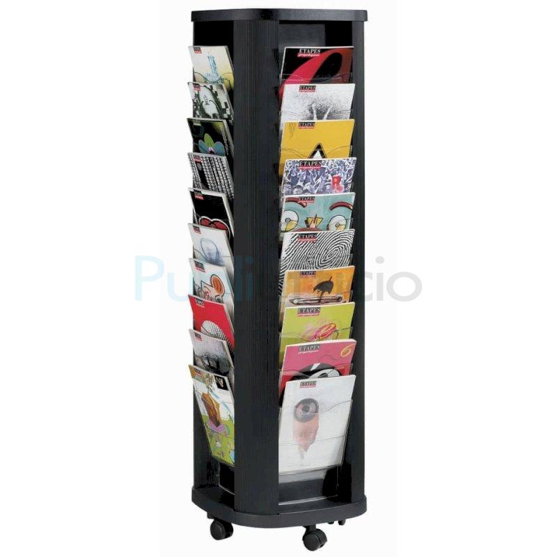 Elegante portariviste rotante con struttura in metallo con 40 ripiani in plastica trasparente sui 4 lati per documenti A4. Spazio utile per ripiano 2,3 cm. Dotato di ruote. Dimensioni (LxPxH) 44x44x148,5 cm. Colore nero.