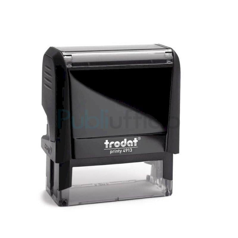 Timbro di testo autoinchiostrante personalizzato TRODAT PRINTY 4913 ECO - 58 x 22 mm - max 6 righe. Personalizzazione dell’impronta disponibile nei colori NERO, BLU, VERDE, ROSSO. NERO. Leggero e compatto. Massima qualità delle impronte. Inchiostro indelebile in conformità alla norma DIN ISO 14145-2. Modello cartuccia di ricambio Trodat 6/4913. Sostituzione della cartuccia più semplice e pulita. Posizionamento preciso grazie alla base trasparente. Prodotto in materiale riciclato post consumo.