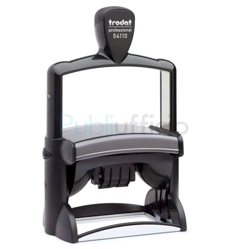 Timbro datario personalizzato TRODAT PROFESSIONAL 54110 - 85 x 44 mm - altezza caratteri data: 4 mm - fino a 6+6 righe. Personalizzazione dell’impronta disponibile nei colori NERO, BLU, VERDE, ROSSO. Struttura interna in acciaio. Impugnatura ergonomica per uso professionale. Massima qualità delle impronte. Inchiostro indelebile in conformità alla norma DIN ISO 14145-2. Modello cartuccia di ricambio Trodat 6/511. Sostituzione della cartuccia semplice e pulita. Regolazione pulita della data grazie alla copertura delle bande. Validità datario 12 anni. Semplice posizionamento dell'impronta. Prodotto eco sostenibile.