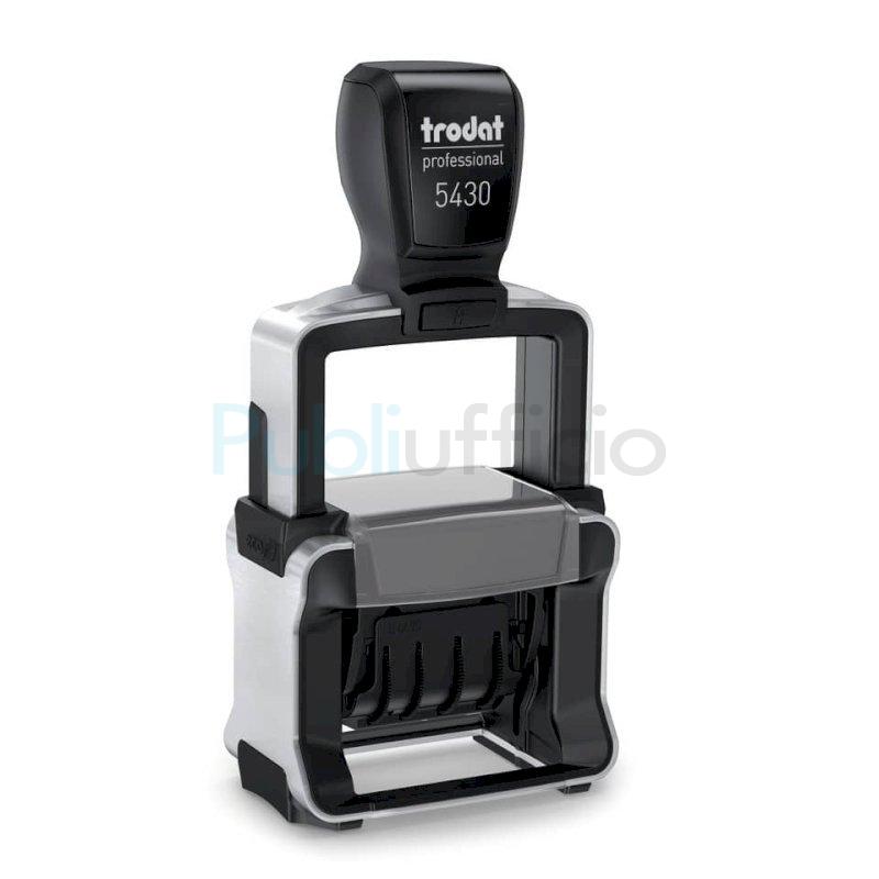 Timbro datario personalizzato TRODAT PROFESSIONAL 5430 4.0 - 41 x 24 mm - Altezza caratteri data: 4 mm - max 2+2 righe. Personalizzazione dell’impronta disponibile nei colori NERO, BLU, VERDE, ROSSO. Solida struttura in acciaio INOX. Impugnatura ergonomica per uso professionale. Massima qualità delle impronte. Inchiostro indelebile in conformità alla norma DIN ISO 14145-2. Modello cartuccia di ricambio Trodat 6/50. Sostituzione della cartuccia più semplice e pulita. Regolazione pulita della data grazie alla copertura delle bande. Validità datario 12 anni. Semplice posizionamento dell'impronta. Prodotto eco sostenibile.