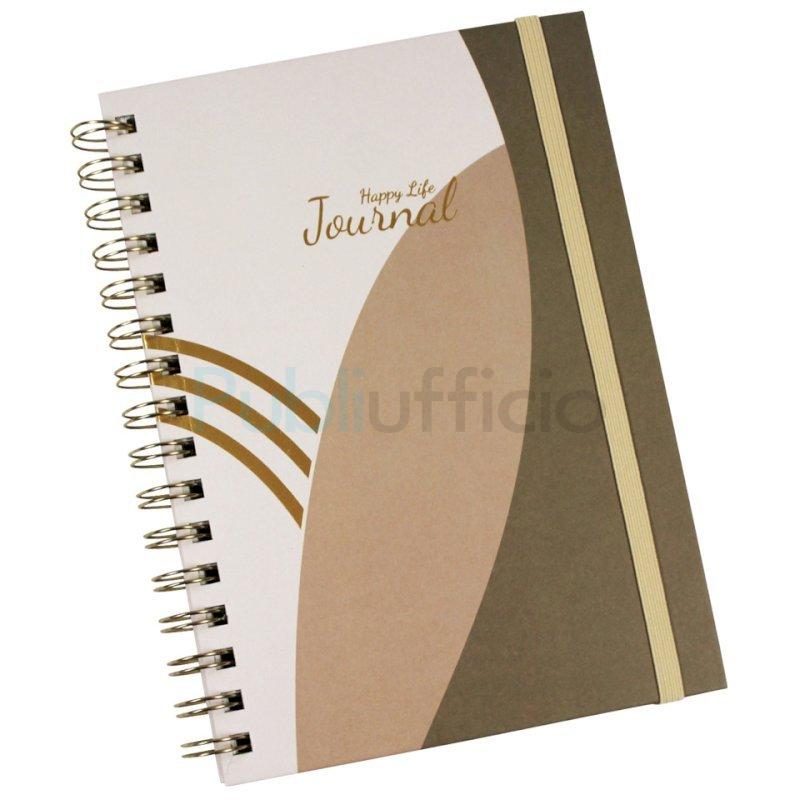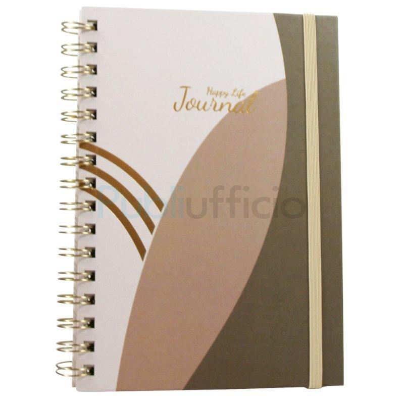 Quaderno spiralato “Happy Life Journal”. Realizzato con copertina in robusto cartone con fantasia verde. Formato: A5. Dimensioni: 14,8 x 21 cm. Composto da 100 fogli da 80 g/m², a quadretti 5 mm, in color crema e foderati. Dotato di elastico e tasca per archivio. La spirale è dorata e posizionata sul lato lungo a sinistra. Ideale per prendere appunti.