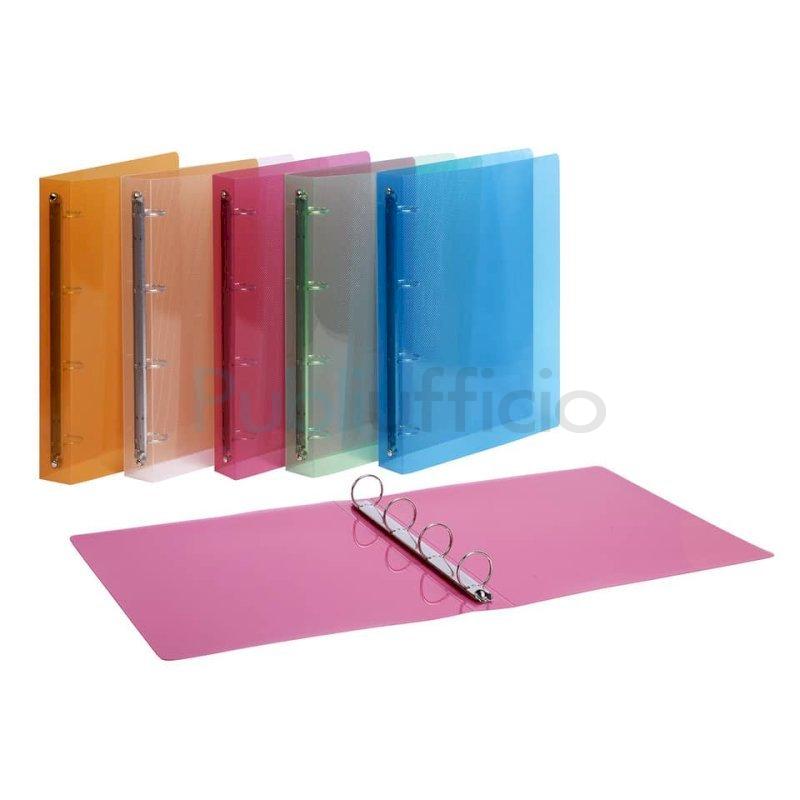 Raccoglitori ad anelli Lumina, realizzati in polipropilene trasparente colorato con speciale finitura rigata. Meccanismo a 4 anelli tondi diametro 30 mm. Formato interno 22x30 cm. Colori assortiti: arancio, fucsia, verde, azzurro e neutro.