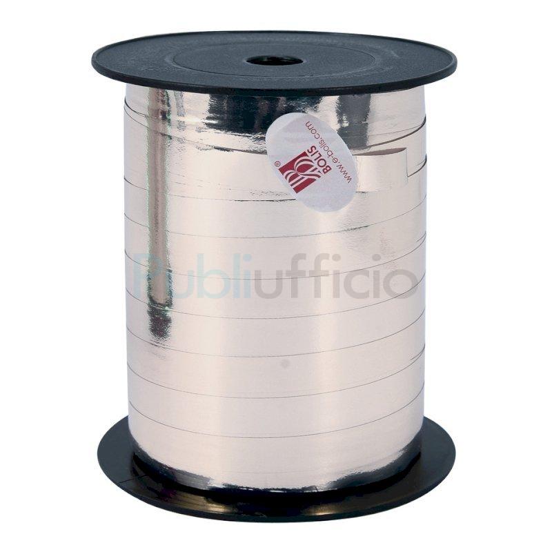 Rotolo di nastro in polipropilene. Formato 10 mm x 50 m. Colore argento lucido.
