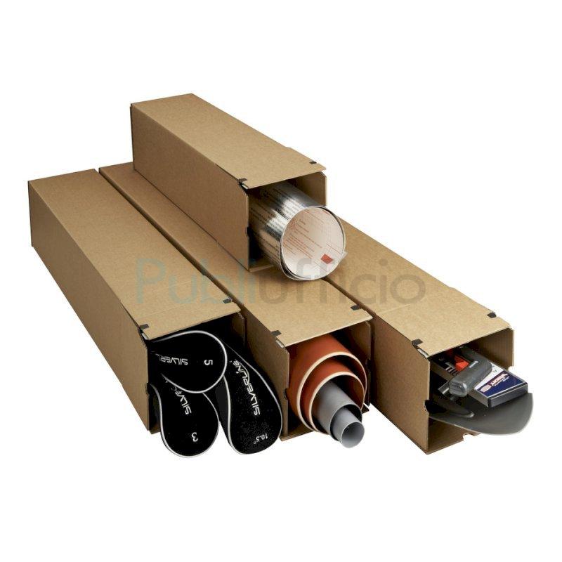 Scatole per spedizione a tubo Bong Square Box. Forma a tubo quadrata. Ideali per la spedizione di articoli lunghi, disegni, poster, mappe ecc. Consegnate stese in confezione salva-spazio. Possibilità di regolare la lunghezza grazie alla scatola telescopica. Elevato grado di resistenza e protezione. Formato interno 105 x 105 x 610 mm. In confezione da 10 scatole. Apertura facilitata.