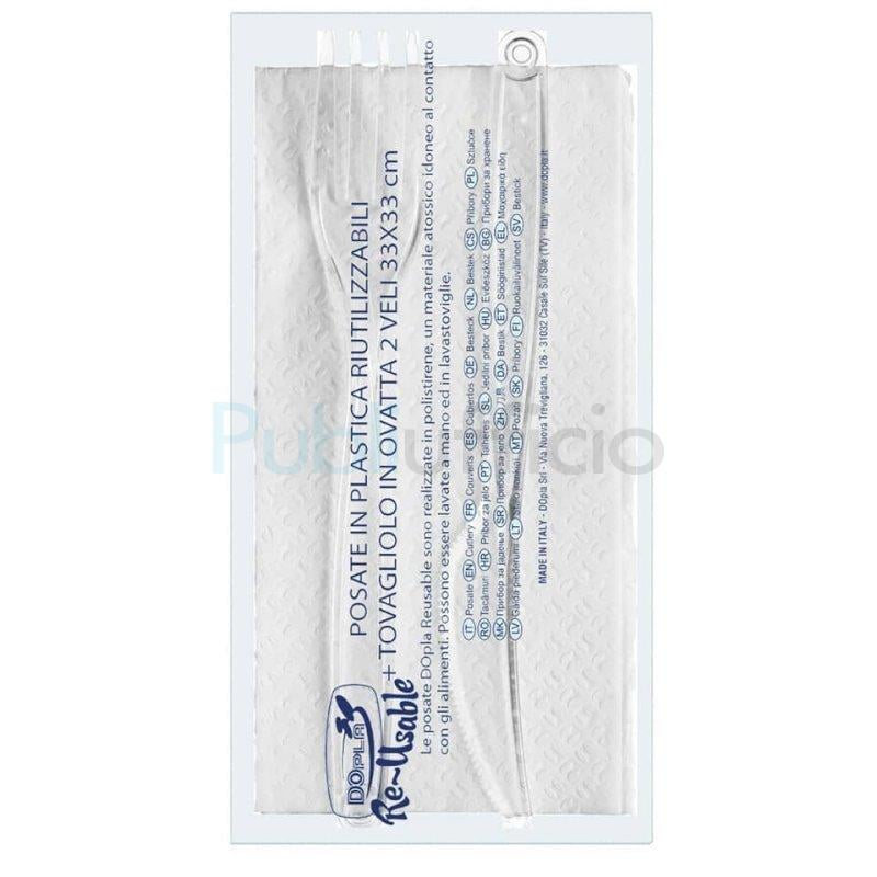 Set 2 posate trasparenti Dopla Reusable in PS con tovagliolo 33x33 cm - conf. 100 pz - 03943