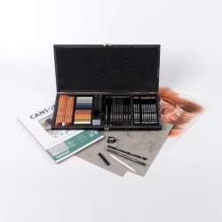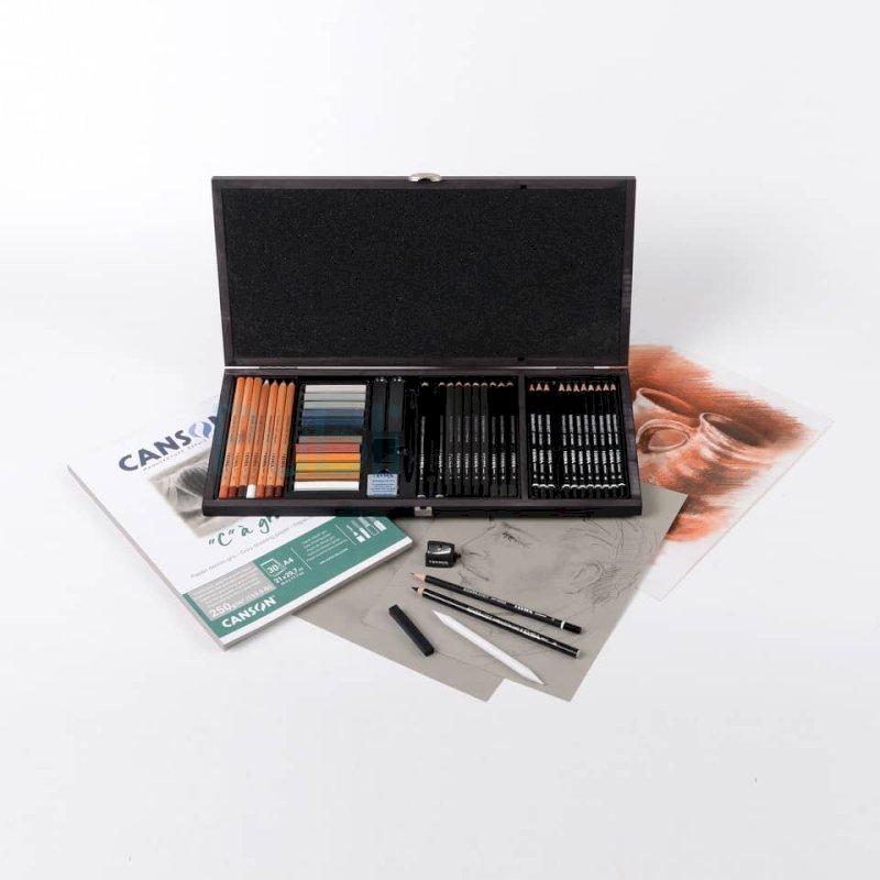 Cassetta in legno contenente 1x matita bianca Oil; 2x matite sanguigna (Dry, Oil); 2x matite seppia chiaro (Dry, Oil); 2x matite seppia scuro (Dry, Oil); 3x matite carboncino (2B, HB, H); 5x matite carbon (3B, 2B, B, HB, H); 3x matite carbon extra dark (2B, HB, H); 12x matita in grafite (6B, 5B, 4B, 3B, 2B, B, HB, F, H, 2H, 3H, 4H). Pastelli quadri: 1x pastello bianco; 1x pastello ocra gialla chiara; 1x pastello giallo indiano; 1x pastello terra di Siena naturale; 1x pastello ocra d’oro; 1x pastello terra di Siena naturale scura; 1x pastello grigio neutro; 1x pastello grigio caldo 1; 1x pastello grigio freddo 3;1x pastello grigio freddo 4; 1x pastello grigio di Payne; 1x pastello nero; 1x pastello 7x14mm carbon extra dark HB; 1x pastello 7x14mm carboncino 2B; 1x sfumino; 1x temperino; 1x gomma pane. Dimensioni cassetta: 43x20,5 cm.