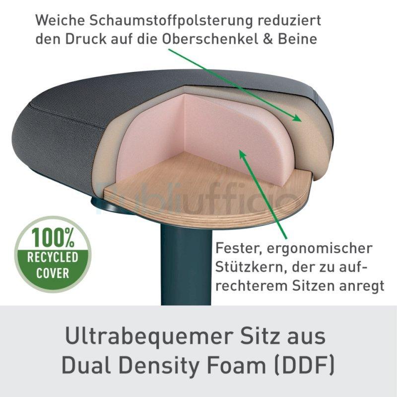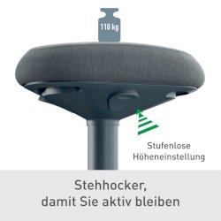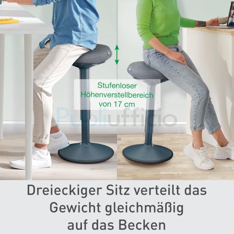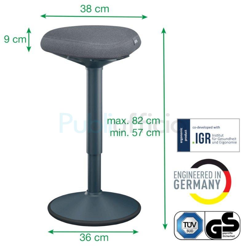 Lo sgabello Leitz Ergo Active è dotato di un esclusivo sedile di comfort in schiuma a doppia densità (DDF) con un nucleo di supporto ergonomico e solido. Simile a uno sgabello, la forma triangolare distribuisce il peso in modo uniforme sul bacino ed è circondata da una morbida imbottitura in schiuma per ridurre la pressione su cosce e gambe. Il sedile di 9 cm di spessore è progettato per garantire il massimo comfort e può essere utilizzato per appoggiarsi o per sedersi completamente, incoraggiando gli utenti a sedersi in posizione più eretta e offrendo un'esperienza di seduta ultra confortevole simile a quella di un cuscino. Sviluppato in collaborazione con l'Istituto per la Salute e l'Ergonomia (IGR), questo sgabello da scrivania ergonomico e regolabile in altezza è stato progettato per mantenervi attivi a casa o al lavoro mentre utilizzate una scrivania in piedi, tavoli da riunione alti o il bancone della cucina. La base arrotondata della sedia sgabello incoraggia il movimento attivo ruotando e dondolando mentre si lavora, rafforzando la schiena e il core e prevenendo dolori e disturbi. Regolazione agevole e facile dell'altezza di 25 cm (57 - 82 cm) con la pressione di un pulsante per passare all'altezza di appoggio perfetta. Il rivestimento del sedile è realizzato con materiale riciclato al 100% e la base in gomma antiscivolo impedisce allo sgabello di scivolare proteggendo il pavimento. Il design leggero e la maniglia per il trasporto sotto il sedile lo rendono facile da spostare da una stanza all'altra e può essere facilmente riposto sotto la scrivania. Questo sgabello moderno e minimalista è ideale per la casa o l'ufficio per migliorare il comfort e massimizzare la produttività. La nostra missione è fornire soluzioni che permettano alle persone di prosperare sul lavoro e oltre, promuovendo una salute mentale e un benessere fisico positivi. Combinabile con molti altri prodotti Leitz Ergo per personalizzare la tua postazione di lavoro flessibile e individuale in modalità sit, stand & move. Rimani attivo e Feel Good con Leitz. Sviluppato in collaborazione con l'Istituto tedesco IGR per la salute e l'ergonomia, secondo la norma DIN 26800 EN ISO 15537, tenendo conto del comfort ergonomico, certificato TÜV e GS per la sicurezza. Dimensioni: 370 x 610 x 377 mm. Peso: 6,1 Kg. Colore: grigio scuro.