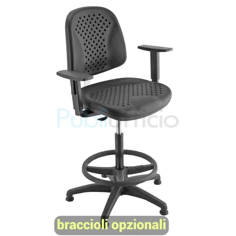 Sgabello tecnico alto Esos EOE21 con alta resistenza. Base in nylon e fiberglass, con poggiapiedi telescopico, seduta con elevazione a gas, schienale regolabile in altezza e profondità. Seduta e schienale in poliuretano integrale autopellante di colore nero. Girevole, a 5 gambe, braccioli opzionali. Misure: Altezza Totale 99-124 cm, Altezza Seduta 59-83 cm, Altezza Schienale 31 cm, Profondità seduta 45 cm, Larghezza Seduta 49 cm, Larghezza Schienale 42 cm. Montare questa sedia è semplice e immediato grazie alle istruzioni allegate al prodotto. Per una corretta pulizia della seduta è sufficiente utilizzare un panno umido e un detersivo poco concentrato. Le macchie leggere si possono eliminare con un detergente per tessuti, con una spugna inumidita in acqua o in una soluzione di acqua e sapone. Le sedute tecniche di Unisit sono destinate a vari utilizzi professionali come laboratori, scuole, officine, casse di supermercati etc. Le sedute tecniche hanno, come prerogativa, l’ampia escursione nella regolazione dell’altezza ed i materiali con cui sono state realizzate.