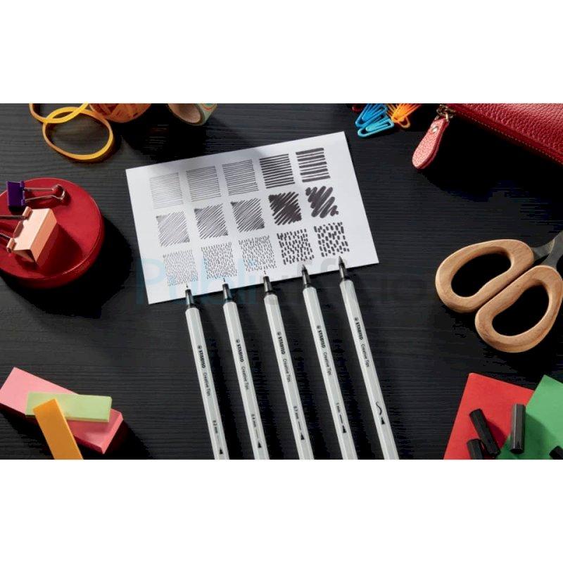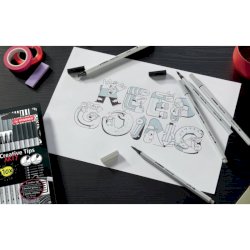 Set stabilo creative tips contenente: tre penne fineliner, un pennarello classico e un pennarello con punta morbida a pennello per scrivere, sottolineare, tracciare linee e contorni, colorare, realizzare schemi, lettering, ombreggiature e sfumature. Ampiezza di tratto da 0,2 mm a 1 mm, oltre alla punta morbida a pennello. L'inchiostro a base d'acqua rende semplicissimo creare favolosi effetti acquarello. Tappo ventilato anti-soffocamento. Il set include tutte e cinque le punte nei colori grigio e nero, per un totale di 10 pezzi.