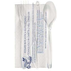 Set 3 posate trasparenti Dopla Reusable in PS con tovagliolo 33x33 cm - conf. 100 pz - 03944