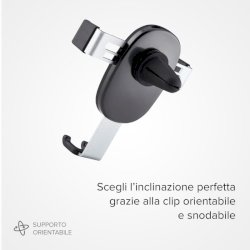 Puoi fissarlo a qualsiasi tipologia di bocchetta d’aerazione della tua auto. Il supporto per telefono Gravity con meccanismo a gravità è dotato di una clip regolabile sul retro per un fissaggio comodo e veloce a qualsiasi modello di bocchetta d’aerazione dell’auto. L’attacco non è mai stato così semplice e immediato. Appoggia il tuo dispositivo per attivare la chiusura automatica. Puoi stabilizzare saldamente il tuo dispositivo smartphone compatibile con schermo fino a 9 centimetri di larghezza come Apple, Samsung, Xiaomi, Oppo, Huawei e molti altri con un semplice gesto. Appoggia il telefono sul morbido pannello in silicone e fallo scivolare sul braccio inferiore del supporto: le morse laterali regolabili da 6 fino ad un massimo di 9 centimetri, si chiuderanno automaticamente grazie al meccanismo a gravità in base al peso dello smartphone per avvolgerlo perfettamente. Ti basterà alzare nuovamente il dispositivo dal supporto per permettere alle morse di aprirsi e sganciarlo. Scegli l’inclinazione perfetta per il tuo schermo. Il supporto auto per telefono Gravity con meccanismo a gravità è caratterizzato dalla clip orientabile e snodabile che offre una visualizzazione ottimale dello schermo. Puoi scegliere quindi come posizionare al meglio il tuo dispositivo e avere l’inclinazione ideale per abilitare il riconoscimento facciale senza allontanare le mani dal volante. Design minimale ed elegante. Il supporto auto per telefono Gravity con meccanismo a gravità si distingue per le finiture in metallo che lo rendono un accessorio elegante e minimale. Cosa lo contraddistingue: Chiusura automatica con meccanismo a gravità; Morse laterali regolabili in modo automatico in base al peso del dispositivo; Rapido e facile sistema di sgancio alzando il dispositivo dalle morse laterali; Supporto auto con clip orientabile e snodabile per visualizzazione ottimale dello schermo; Fissaggio universale alla bocchetta d’aerazione dell’auto tramite clip regolabile sul retro; Compatibile con dispositivi smartphone con schermo fino a 9 centimetri come Apple, Samsung, Xiaomi, Huawei, Oppo e molti altri; Apertura massima delle morse laterali: 9 centimetri; Apertura minima della morse laterali: 6 centimetri; Pannello morbido in silicone su cui appoggiare il dispositivo; Design in metallo. Cosa include la confezione: Il supporto auto per telefono Gravity con meccanismo a gravità.