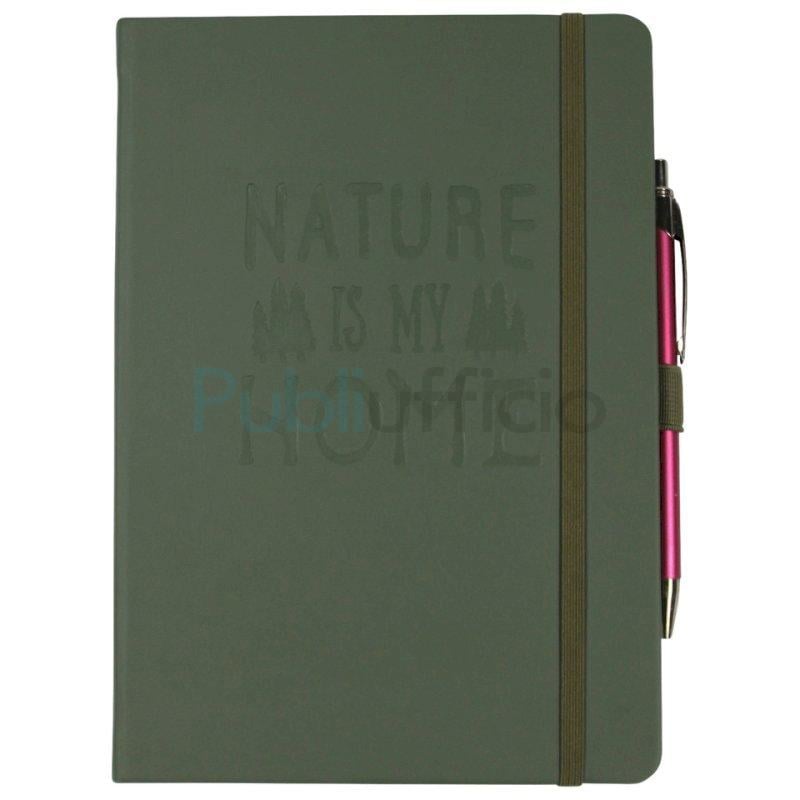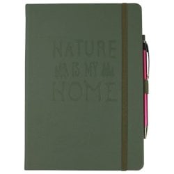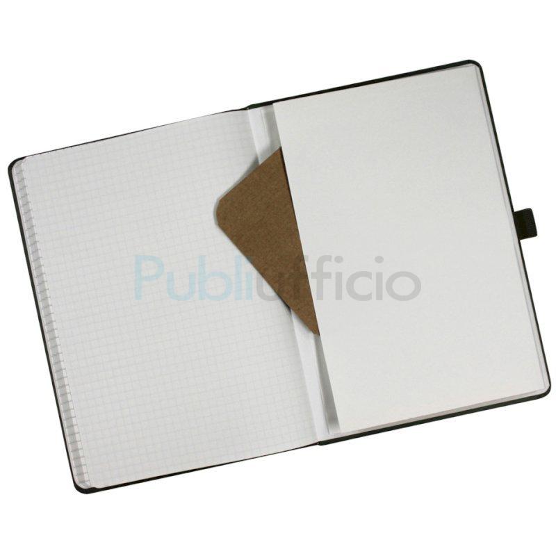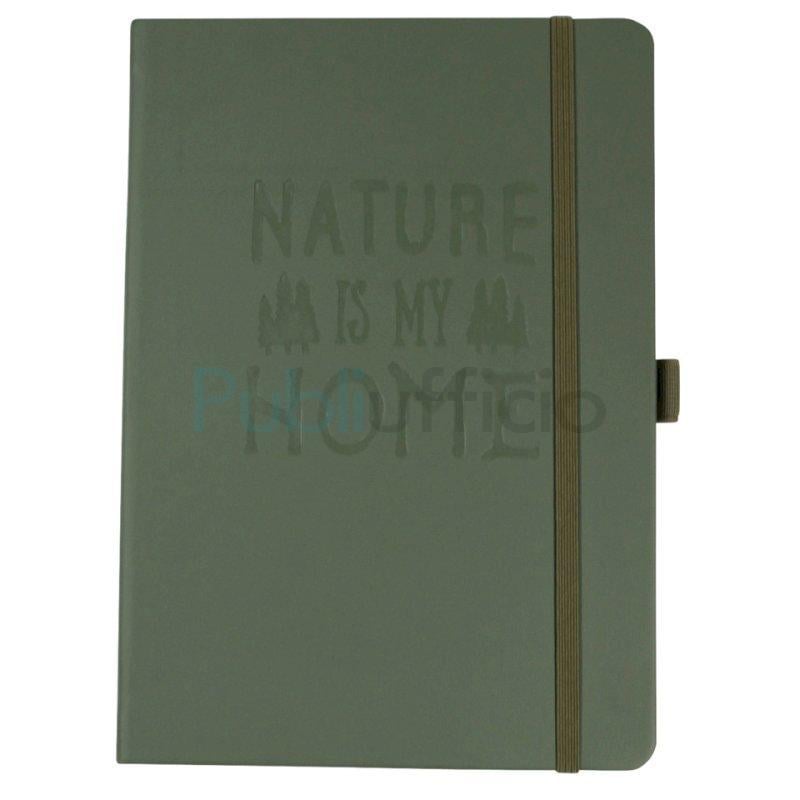 Taccuino specifico per attività all'aperto (escursionismo, ciclismo, sci alpinismo, campeggio, pesca...). Formato A5. Dimensioni: 15,1 x 21,5 cm. Realizzato con copertina impermeabile in PU e disegno in rilievo. Dotato di passante per penna, elastico di chiusura e tasca per archivio. Composto da 56 fogli di carta di pietra idrorepellente a quadretti. Grammatura: 120 g/m². Colore verde oliva.