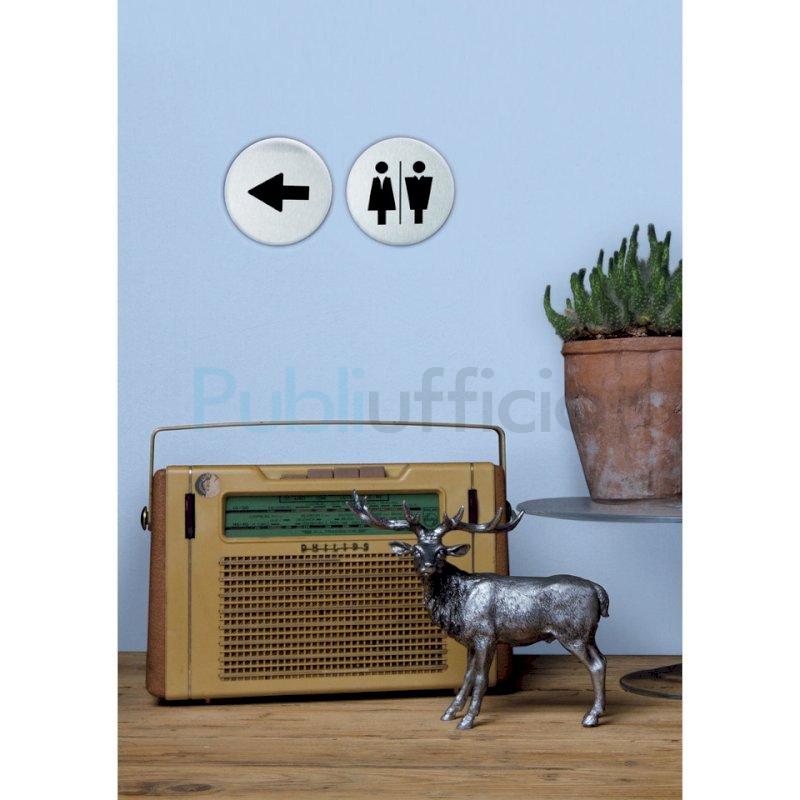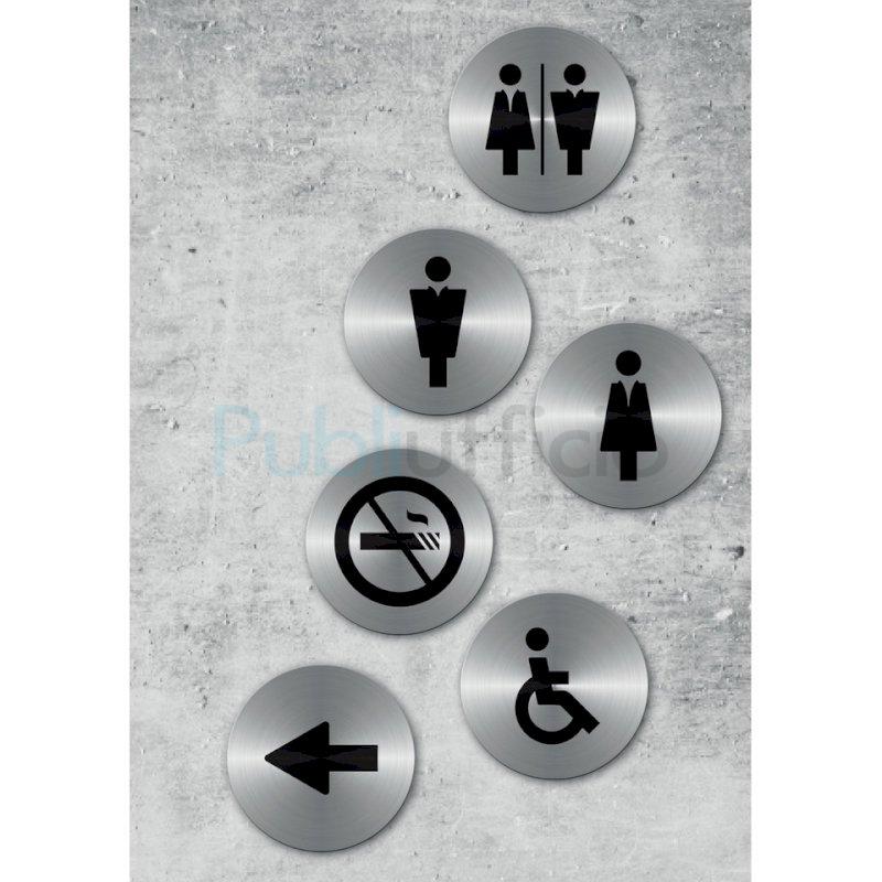 Targhette adesive in acciaio inox assortite. Sei targhette da attaccare sulla porta o sui muri. Icone: Donna, Uomo, Donna/Uomo, Accessibile ai disabili, Freccia e Vietato Fumare.