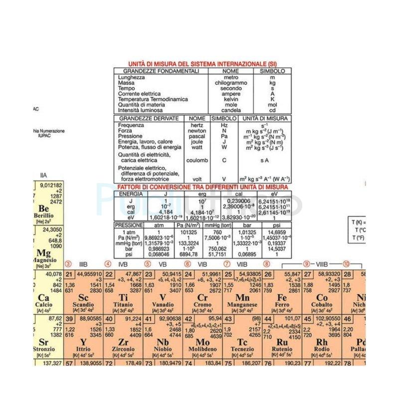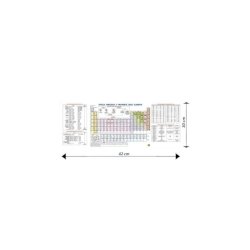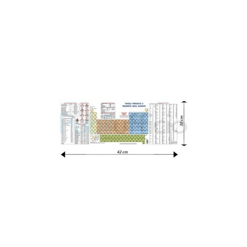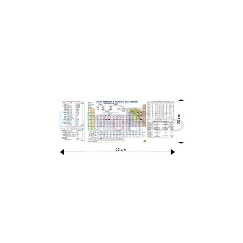 La tavola periodica degli elementi riporta numerose informazioni riguardanti le proprietà degli elementi: massa atomica e numero atomico, valenza, numeri di ossidazione, elettronegatività, raggio atomico, covalente e ionico, volume atomico, densità, calore specifico, di vaporizzazione, di fusione, conducibilità elettrica e termica, temperature di fusione ed ebollizione, configurazione elettronica, stato di aggregazione a 25 °C, struttura cristallina, proprietà acido-base. Sono riportati, inoltre, anno di scoperta e nome dello scopritore. Il fondo colorato delle caselle consente di individuare la tipologia dell’elemento (metallo alcalino, alcalino-terroso, di transizione, alogeno…). Aggiornata con i nomi e le informazioni conosciute per gli elementi dell’ultimo periodo. Grazie alla speciale plastificazione opaca antiriflesso è garantita un’ottima leggibilità in ogni condizione di luce. La piega a 4 ante permete di utilizzare e trasportare senza problemi la Tavola. Formato 42 x 30 cm (A3).