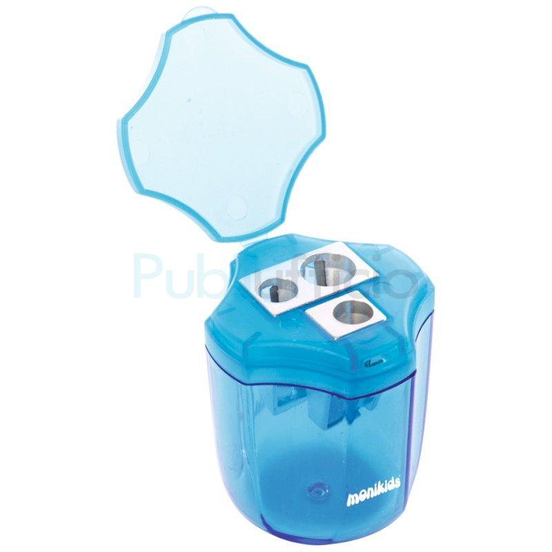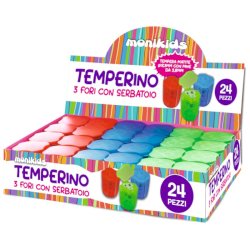 Temperamatite in metallo a 3 fori per matite e pastelli con fori di 3 diverse dimensioni, dotato di serbatoio e tappo. Disponibile in 3 diversi colori, blu, rosso e verde.