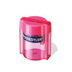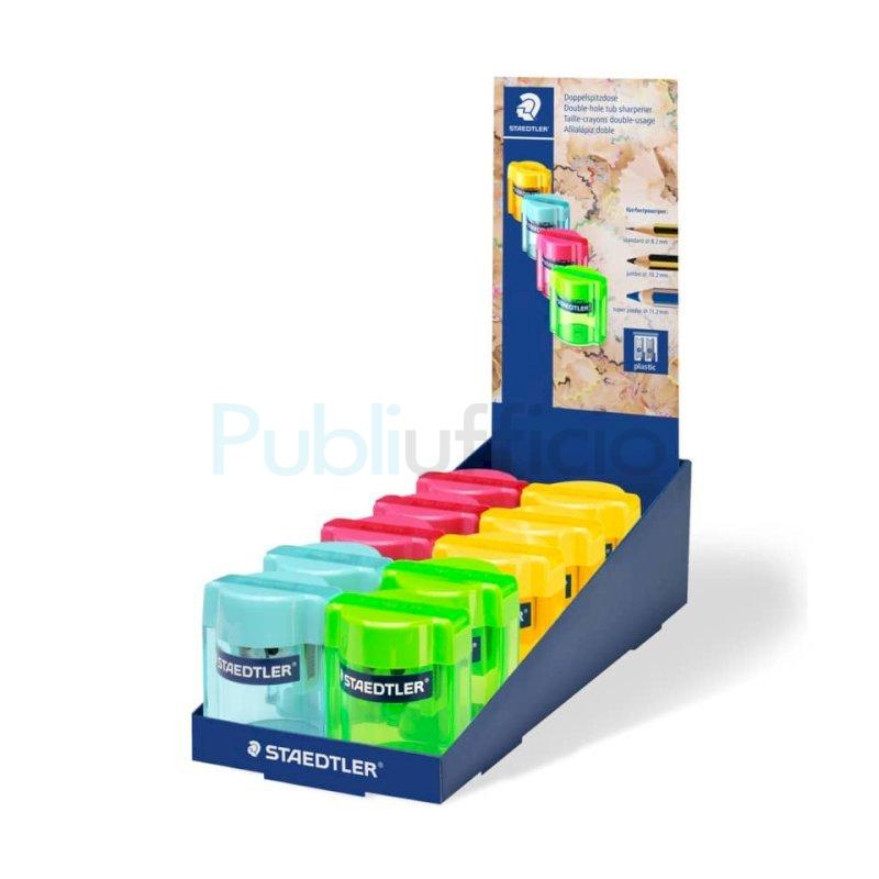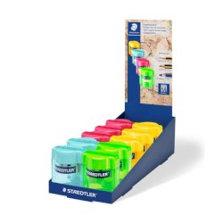 Temperamatite Staedtler a 2 fori con serbatoio. Per matite grafite fino Ø di 8,2 mm con un angolo di affilatura di 23°, per linee precise ed accurate. Per matite di grafite e colorate fino Ø di 8,2 mm con un angolo affilatura di 30° per tratti morbidi e intensi. Chiusura trasparente anticaduta trucioli. Coperchio con chiusura di sicurezza per evitare aperture accidentali. 10 temperamatite compongono un espositore.