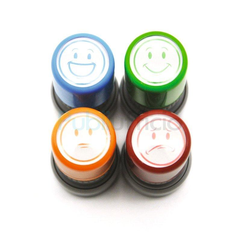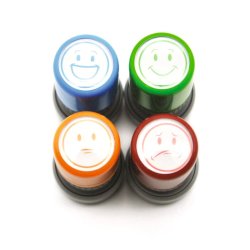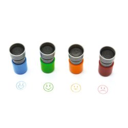 I timbri preinchiostrati raffigurano 4 faccine con diverse espressioni con le quali gli insegnanti potranno valutare il lavoro degli alunni. Diametro timbri 10 mm.
