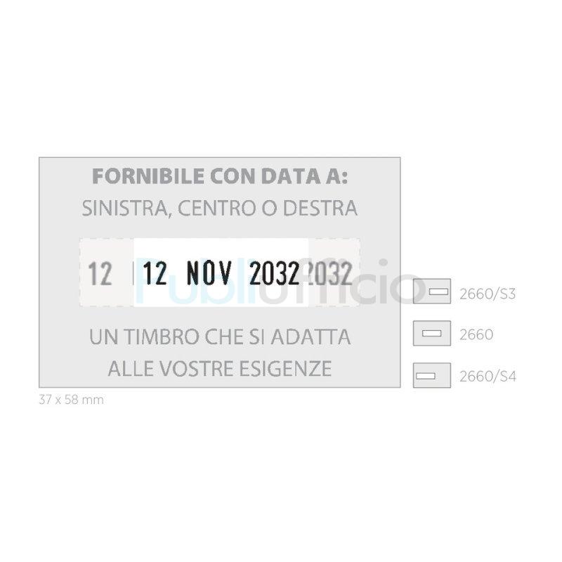 Timbro datario con piastra personalizzabile autoinchiostrante. Carattere 4 mm. Struttura in metallo. Formato: 37 x 58 mm. Cuscinetto di ricambio: E/2600 - E/2600/2.