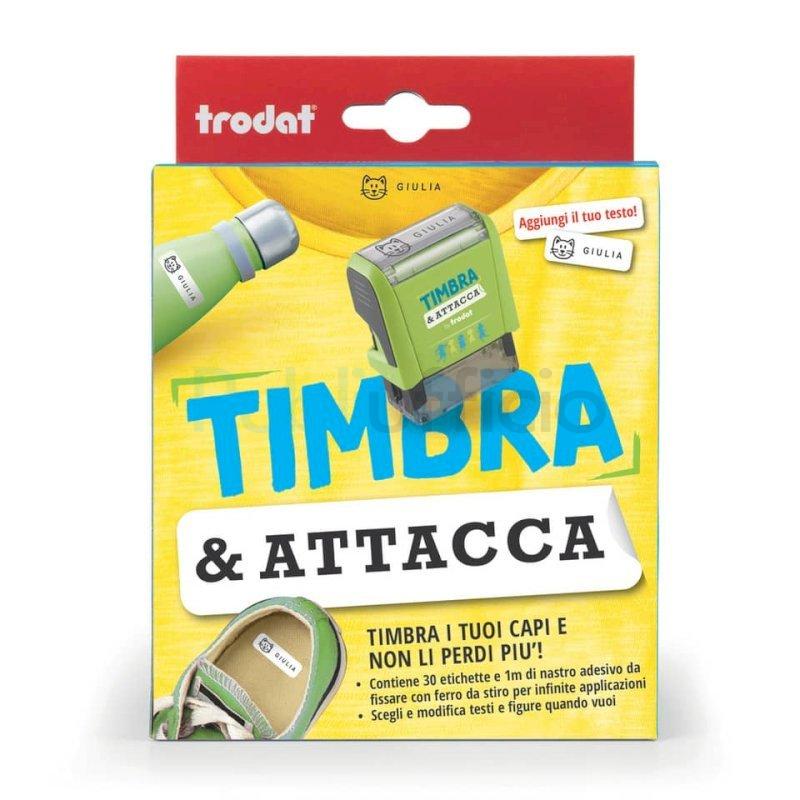 Ideato per la scuola è perfetto anche per ufficio, magazzino, palestra e tempo libero, ospedali, RSA e comunità in genere, ovunque sia necessario ETICHETTARE FACILMENTE CON INCHIOSTRO INDELEBILE i propri effetti personali per non perderli. Timbra Attacca include 1 timbro verde con cartuccia d'inchiostro per tessuti nero, 1 set di lettere e numeri con icone divertenti, 30 adesivi in 2 formati 40 x 10 mm e 40 x 15 mm, 1 m di nastro termoadesivo, 1 pinzetta. Inchiostro dermatologicamente testato, lavabile in lavatrice fino a 95 °C se timbrato direttamente sui tessuti, fino a 60 °C se timbrato su tessuto non tessuto, lavabile in lavastoviglie fino a 75 °C se timbrato sulle etichette applicate su una vasta gamma di materie plastiche. Ideale per timbrare direttamente su tessuti, carta e cartone, contrassegnare le etichette da applicare sui materiali più duri tra cui scarpe, borracce, giocattoli, matite, materiale scolastico ecc; per una maggiore leggibilità sui tessuti scuri è disponibile il nastro termoadesivo da timbrare e fissare con il ferro da stiro direttamente sul vestiario. Altezza del carattere 4 mm per testi fino a 3 righe composte al massimo da 14 caratteri ciascuna.