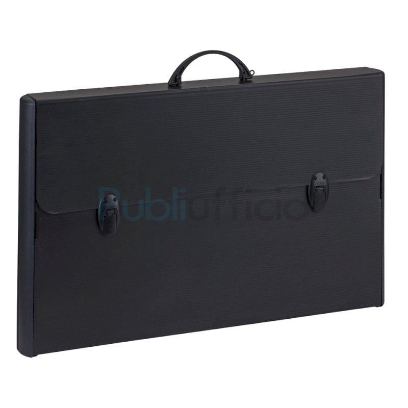 Valigetta Hardox Total Black in polipropilene alveolare nero con dorsi rigidi arrotondati in PP nero. Ideale per riporre e trasportare comodamente documenti, disegni, progetti, blocchi con formato 24 x 33 cm o 33 x 48 cm e righe lunghe fino a 60 cm. Dotata di due chiusure a clip. Dimensioni (L x H x P): 60 x 37 x 5 cm. Completa di film protettivo.
