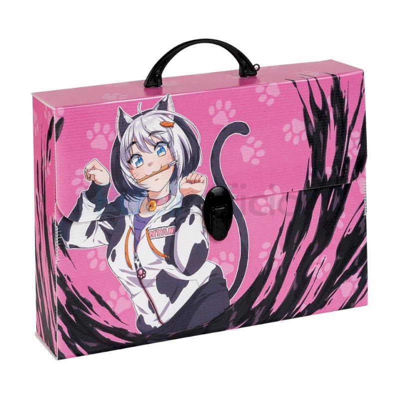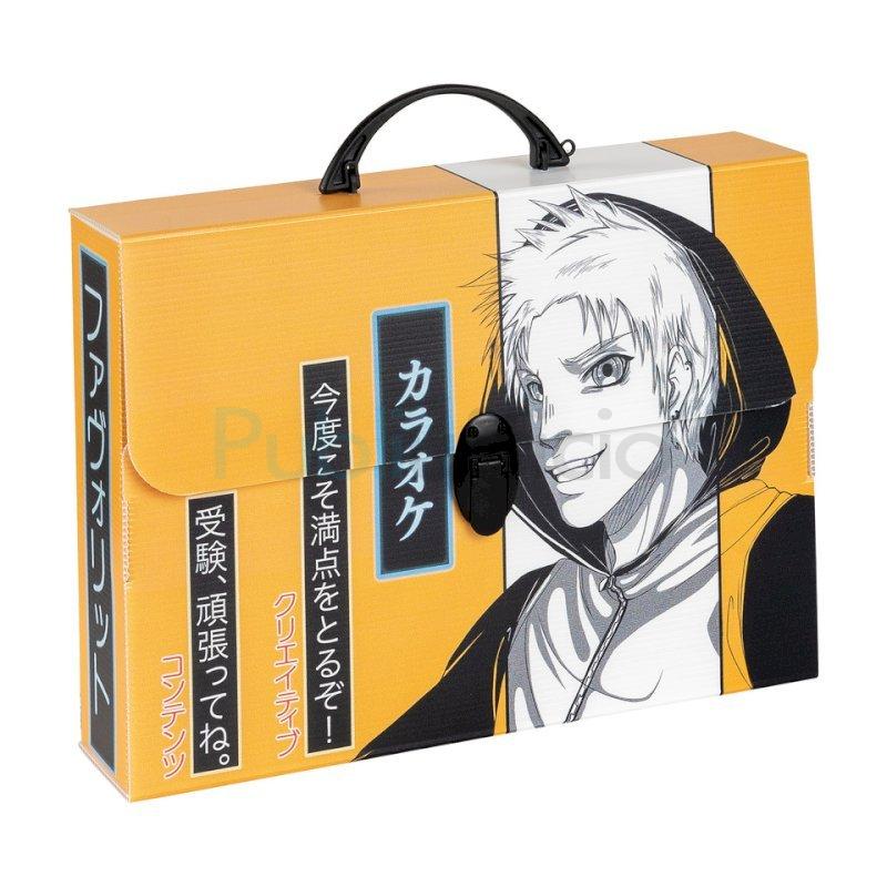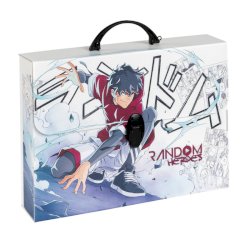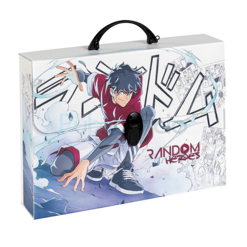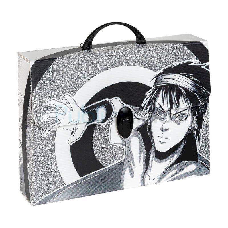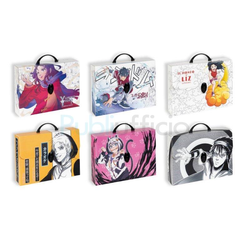 Valigetta in polipropilene alveolare con stampa ''MANGA''. Realizzate in collaborazione con l'Accademia Europea di Manga. Disponibili in 6 soggetti assortiti. Complete di film protettivo e chiusura a1 clip. Dimensioni 37,5x27x8 cm.