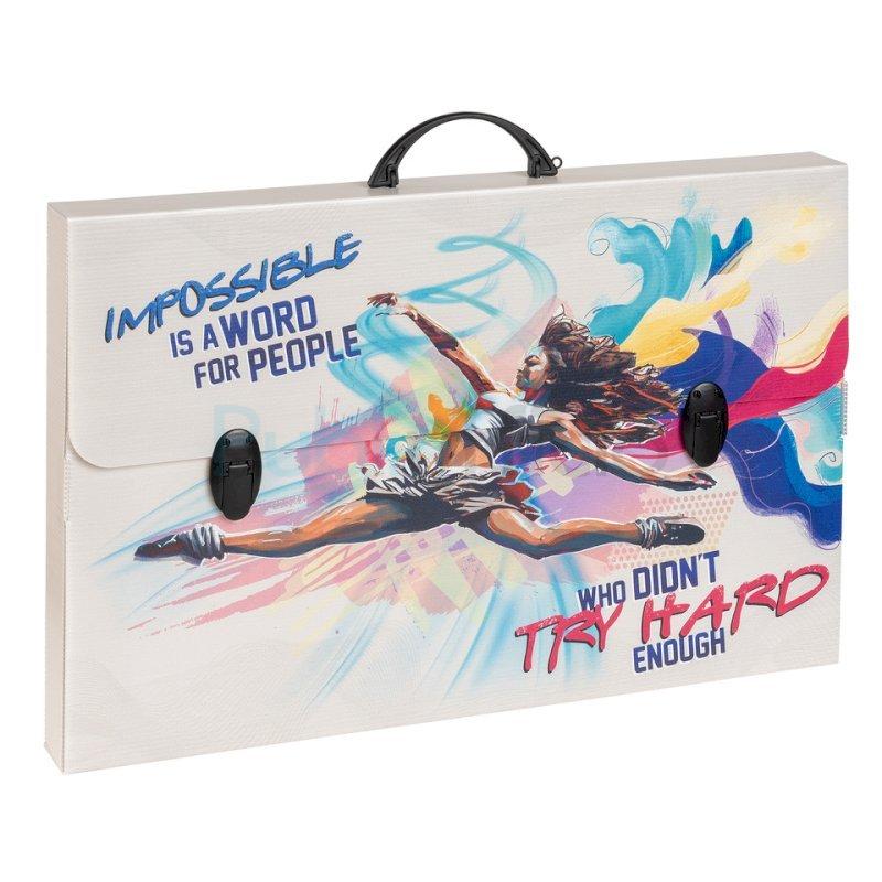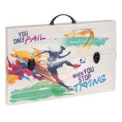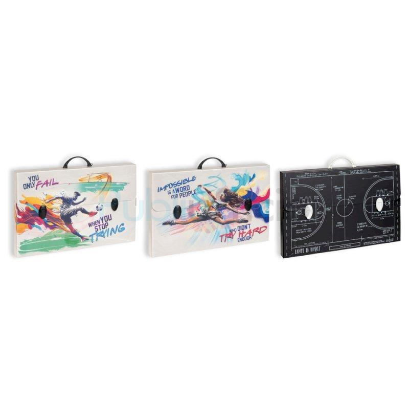 Valigetta in polipropilene alveolare con stampa ''SPORT''. Disponibili in 6 soggetti assortiti. Complete di film protettivo e chiusura a 2 clip. Dimensioni 56,5x36,5x5,5 cm.