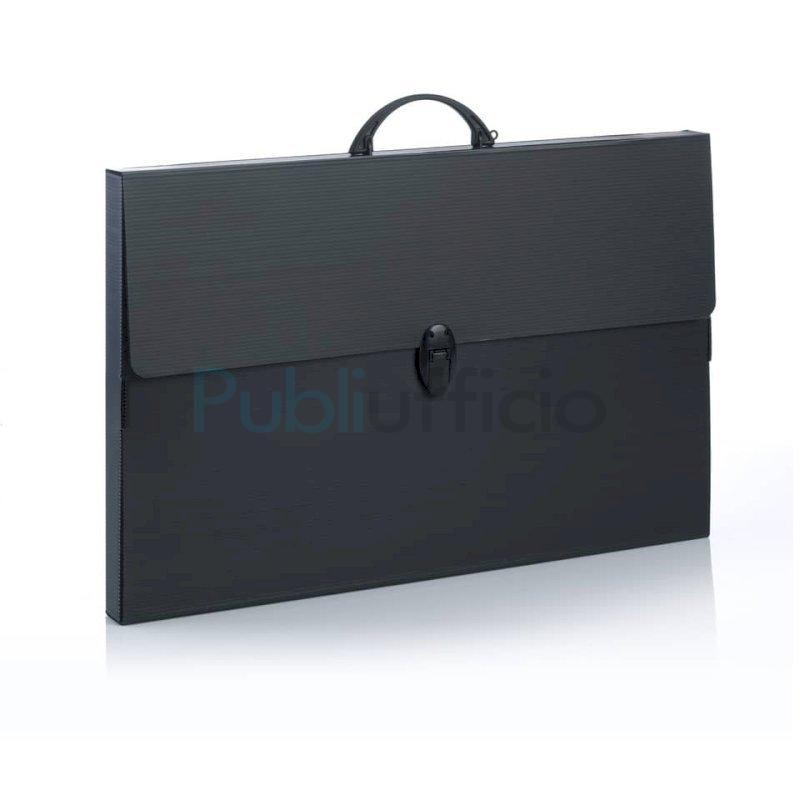 Valigetta Every Line Total Black in polipropilene alveolare nero. Ideale per riporre e trasportare comodamente documenti, disegni, progetti e righe lunghe fino a 60 cm. Completa di film protettivo, maniglia e una pratica chiusura a scatto. Formato: (L) 56,5 x (H) 36,5 cm. Dorso 3,5 cm. Colore nero.
