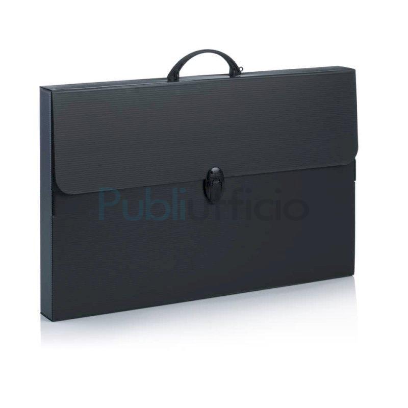 Valigetta Every Line Total Black in polipropilene alveolare nero. Ideale per riporre e trasportare comodamente documenti, disegni, progetti e righe lunghe fino a 60 cm. Completa di film protettivo, maniglia e una pratica chiusura a scatto. Formato: (L) 56,5 x (H) 36,5 cm. Dorso: 5,5 cm. Colore nero.