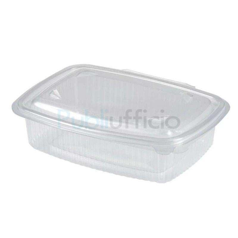 Vaschette realizzate in polipropilene con coperchio incernierato trasparente. Altezza: 57 mm. Adatte al contatto con alimenti: fino a una temperatura massima di 90 °C per 15 minuti. Utilizzabili in microonde fino a 500 Watt per 2 minuti. No grill. Capienza: 500 ml. Confezione composta da 50 pezzi.